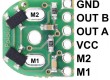The encoder board is designed to be soldered directly to the back of the motor, with the back shaft of the motor protruding through the hole in the middle of the circuit board. One way to achieve good alignment between the board and the motor is to tack down the board to one motor pin and to solder the other pin only when the board is flat and well aligned. Be careful to avoid prolonged heating of the motor pins, which could deform the plastic end cap of the motor or the motor brushes. Once the board is soldered down to the two terminals, the motor leads are connected to the M1 and M2 pads along the edge of the board; the remaining four pads are used to power the sensors and access the two quadrature outputs:
