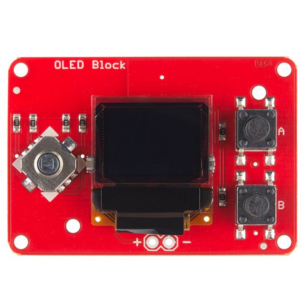 Equip your Edison with a graphic display using the Edison OLED Block! Simply snap this board onto your Edison to gain access to a 0.66", 64x48 pixel monochrome OLED. To add some control over your Edison and the OLED, this board also includes a small joystick and a pair of push-buttons which can be used them to create a game, file navigator, or more!