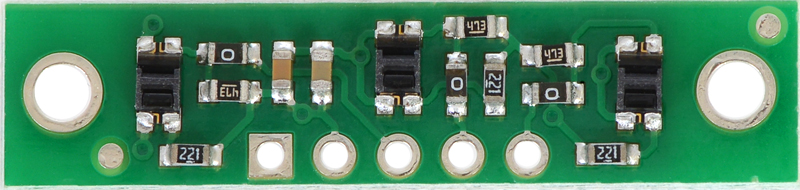 This module has two mounting holes intended for #2 screws (not included); if the mounting holes are not needed, the ends of the PCB can be ground off to make the unit even smaller (less than 1″ wide). The reflectance sensor array ships with a 1×5 straight male header strip and a1×5 right-angle male header strip. You can also solder wires, such as ribbon cable, directly to the pads for the smallest installation.