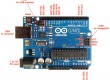 Arduino Uno R3 es una placa electronica basada en el microcontrolador Atmega328 y que tiene su módulo USB mejorado. Dispone de 14 entradas/salidas digitales y 6 de estas pueden utilizarse para salidas PWM. Además dispone de 6 entradas analogicas, un oscilador de 16MHz, una conexión USB, un conector de alimentación, un header ICSP y un pulsador para el reset. La placa lleva todo lo necesario para soportar el microcontrolador. Para empezar a utilizar la placa sólo es necesario conectarla a la PC a través de un cable USB, o alimentarla con un adaptador de corriente AC/DC. También, para empezar, puede alimentarse sencillamente con una batería. Una de las caracteristicas principales de la UNO es que no utiliza el convertidor USB-serial FTDI. Por el contrario, ofrece el microcontrolador Atmega8U2 programado como convertidor USB-serial. UNO es la ultima de una serie de placas Arduino USB y el modelo de referencia para la plataforma Arduino.
