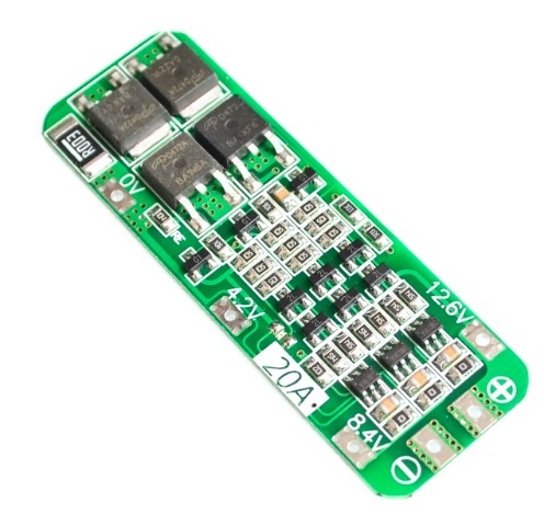 Módulo de gestión (BMS) para baterías 18650 Li-Ion, con capacidad de 3 celdas de 3.7V/4.2V cada una en serie. Posee protección contra sobrecarga, sobredescarga, sobrecorriente, y cortocircuito. Puede manejar corrientes de hasta 20A.