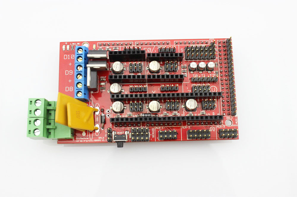 The RAMPS is an all-in-one design to fit the necessary components for a 3D printer into one plug in shield for an Arduino MEGA. The plug in shield design includes plug in stepper drivers and extruder control electronics sockets for easy service, part replacement, upgrade-ability and expansion. Additionally, a number of Arduino expansion boards can be added to the system as long as the main RAMPS board is kept to the top of the stack. Ramps boards are the heart of most DIY 3D printers on the market and a nice clean compact way to integrate all the systems into a compact enclosure mountable format.